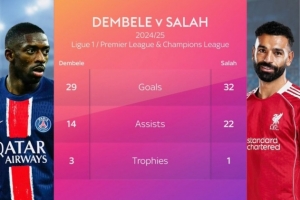 日前,英媒《天空体育》对比了登贝莱、萨拉赫2024/25赛季在联赛和欧冠的数据。