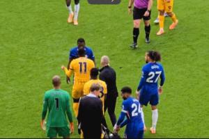 随后布莱顿后卫范赫克走过来抓住凯塞多手臂,凯塞多用力挣脱。范赫克痛苦倒地,巴迪亚西勒上前想把范赫克拉起来。