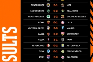 体育资讯10月3日讯 欧联杯联赛阶段第二轮比赛战罢,罗马0-1不敌里尔,费内巴切2-1战胜尼斯,巴塞尔2-0击败斯图加特,费耶诺德0-2落败于维拉。