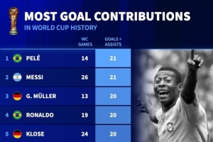 体育资讯10月8日讯 德国转会市场统计了球员在世界杯(决赛圈阶段)参与进球的数量,并列出榜单,贝利、梅西参与21球并列居首。
