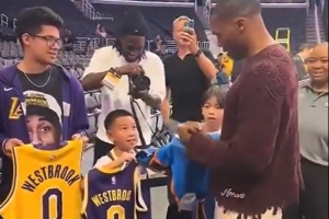 威少给小球迷的球衣签名,签了雷霆和火箭的唯独略过了湖人的。