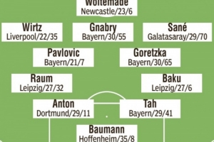 中场:帕夫洛维奇(拜仁)、格雷茨卡(拜仁)、维尔茨(利物浦)、格纳布里(拜仁)、萨内(加拉塔萨雷)
