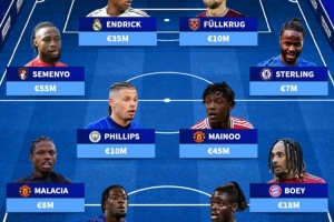 中场:塞梅尼奥(伯恩茅斯,5500万)、卡尔文·菲利普斯(曼城,1000万)、梅努(曼联,4500万)、斯特林(切尔西,700万)