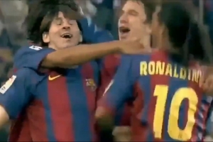 当时巴萨主场2-0击败对手,埃托奥破门,身穿30号的17岁小将梅西替补登场,在最后时刻接小罗助攻打进一线队首球。随后两人跑到场边庆祝,小罗弯下腰,梅西跳到大哥背上庆祝的画面也成为了足坛最经典的画面之一。