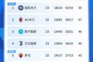 目前国米55分第一,米兰未赛47分第二,那不勒斯46分第三,尤文45分第四,罗马未赛43分第五,科莫41分第6。