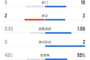 克雷莫内塞半场0-0米兰数据:射门9-10,射正2-2,控球率45%-55%